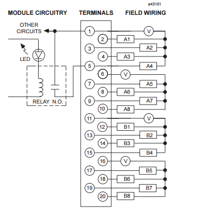 নিম্নোক্ত চিত্র ব্যবহারকারী সরবরাহকৃত লোড ডিভাইসগুলি এবং বিদ্যুৎ উৎসকে ২ amp NO রিলে আউটপুট মডিউলকে সংযুক্ত করার জন্য ওয়্যারিং তথ্য সরবরাহ করে।