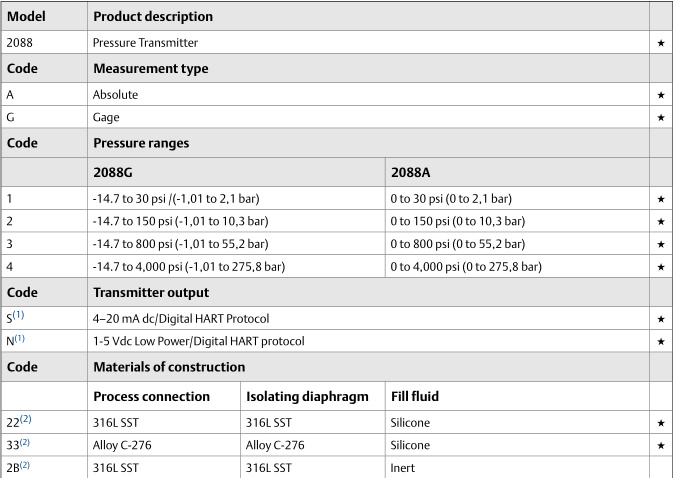 Rosemount 2088 চাপ ট্রান্সমিটার ক্রমানুসার তথ্য (একটি অংশ)