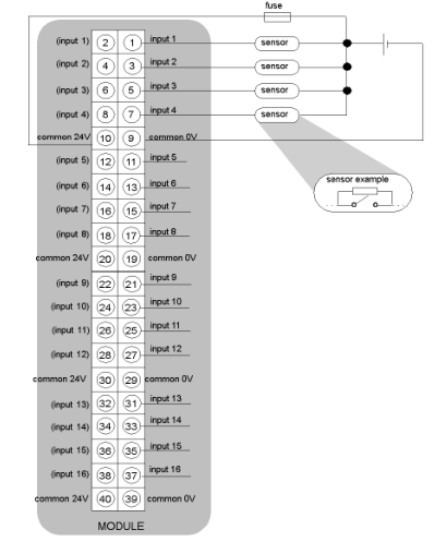 উল্লেখ্য: শুধুমাত্র 16 টি ইনপুট এক গ্রুপ আছে সমস্ত সাধারণ 24 V অভ্যন্তরীণভাবে সংযুক্ত এবং সব সাধারণ 0 V অভ্যন্তরীণভাবে সংযুক্ত করা হয়। একই ইনপুট (যেমনঃ পিন 1 এবং ২ পিন ইনপুট 1) এর দুটি পিনগুলি অভ্যন্তরীণভাবে খুব সংযুক্ত রয়েছে যাতে আপনি সঠিক পিন বা বামের এক ব্যবহার করতে পারেন।