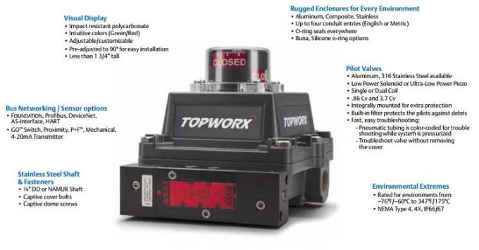 TopWorx ™ বিভাজক ভালভ কন্ট্রোলার FOUNDATION ফিল্ডবাস, DeviceNet, AS- ইন্টারফেস, Profibus, HART এবং ওয়্যারলেস HART প্রোটোকলগুলির মাধ্যমে যোগাযোগ করতে স্বয়ংক্রিয় চালু / বন্ধ ভালভ সক্ষম করে। তারা সমস্ত ঘূর্ণমান এবং রৈখিক ভালভ এবং actuators সংযুক্ত, সবচেয়ে চাহিদা পরিবেশগত অবস্থানে কাজ, এবং বিভিন্ন বিপজ্জনক এলাকা সার্টিফিকেশন বহন।