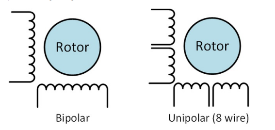 দুটি ফেজ বাইপোলার মোটর দুটি coils গ্রুপ আছে। একটি 4 ফেজ ইউনিপোলার মোটর আছে 4. একটি 2-ফেজ বাইপোলার মোটর প্রতিটি ফেজ জন্য 4 পুতুল থাকবে। কিছু মোটর নমনীয় তারের সাথে আসে যা আপনাকে বাইপোলার অরুনিপোলার হিসাবে মোটর চালাতে দেয়।