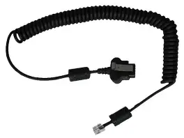 This cable features a coiled, flexible black design. One end connects to the communication port located on the top-left side of the Hand Held Monitor, while the other end directly fits the Block I/O communication port situated on top of the I/O Block terminal—positioned before the first terminal. It supports multiple communication rates: 153.6 Kbaud (standard), 153.5 Kbaud (extended), 76.8 Kbaud, and 38.4 Kbaud. When fully stretched, it reaches a maximum length of 5 feet (1.5 meters) and weighs 2 pounds.